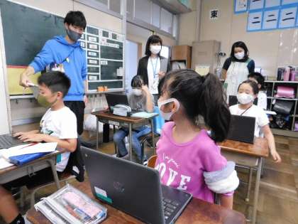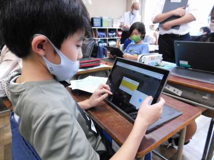 教科は国語の聞く・話す単元です。校庭で自分たちが見つけた自然を題材に、タブレットパソコンを使っての授業です。