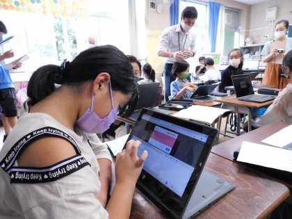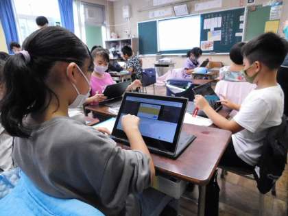 ジャムボードというソフトを使い、友達が撮った写真から見たこと、におい、さわる、聞こえる、あじなど想像したことを付箋の形で貼っていきます。