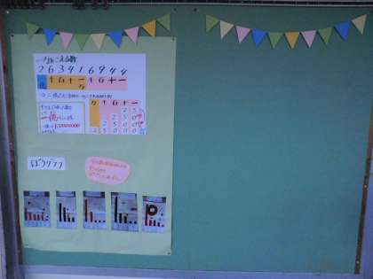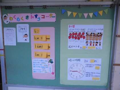 少人数教室の掲示板には「わくわく算数コーナー」が貼られています。理解しやすくまとめられていますね。