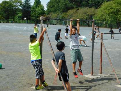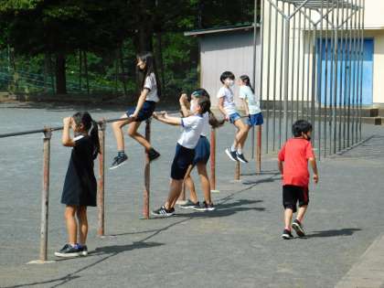 休み時間、鉄棒で遊ぶ子供たちです。
