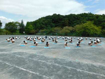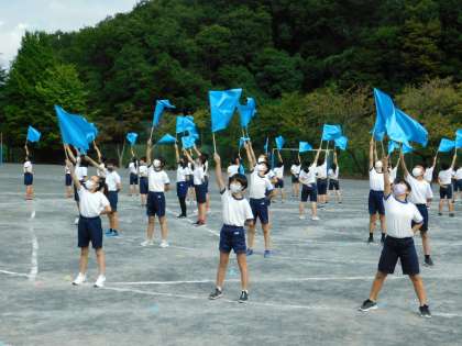6年生が校庭でフラッグの練習に取り組んでいました。