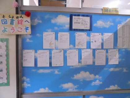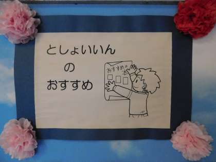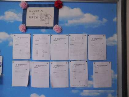 図書室の壁には図書委員会の子のおススメ本紹介がはられています。
