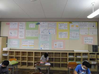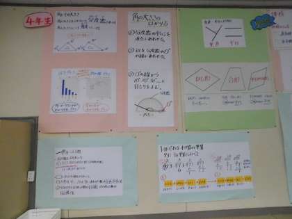 少人数算数の教室です。外のわくわく算数コーナーだけでなく、教室内も学年ごとのワンポイントコーナーが充実しています。