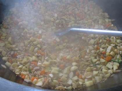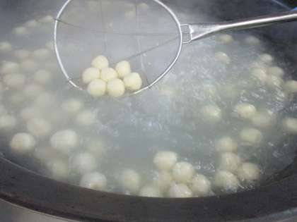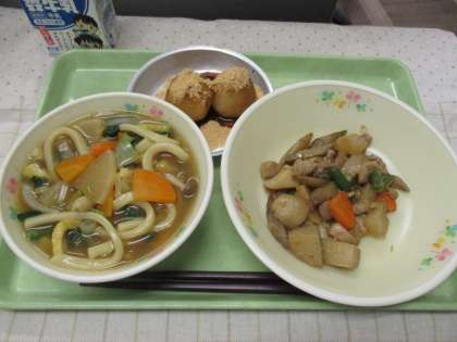 写真はお月見団子をゆでている様子と里芋の煮物の様子です。
