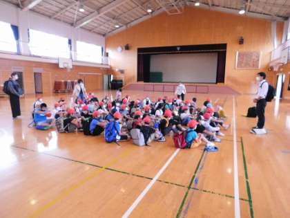 お待ちかねのお弁当タイムです。場所は鑓水小学校の体育館をお借りしました。コロナ禍で公園等でのお弁当ができない状況です。