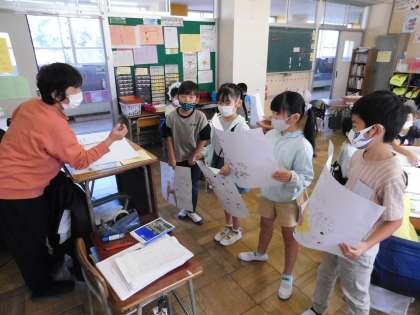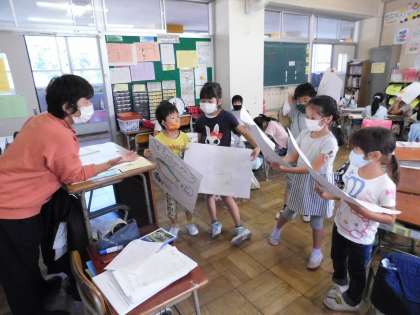 生き物について調べ、明日の学校公開で発表するようです。先生の前でリハーサルをしています。