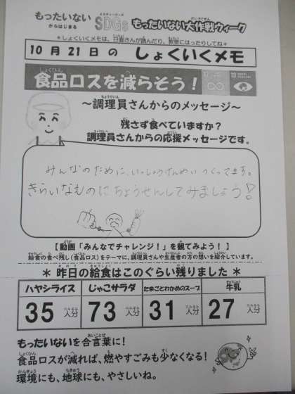 食育メモに調理室よりメッセージをいただきました。
