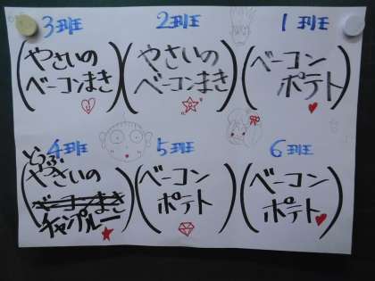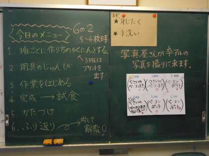16日、6年2組が調理実習を行いました。班ごとにメニューが少しずつ違いますね。