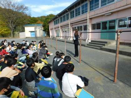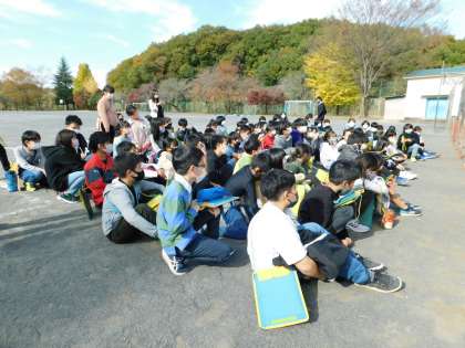 11月19日、5年生が美術館見学に行きました。校庭で、図工の先生の話をしっかり聞いています。