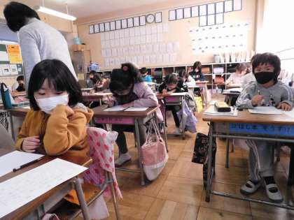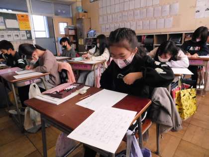 子どもたちは一区切り一区切りずつ習いながら、丁寧な文字で書いていました。