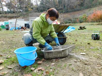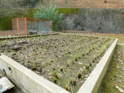 毎年5年生が使っている田んぼです。経年劣化もあり、外壁のコンクリートから水漏れがありました。用務主事さんが修繕してくれています。