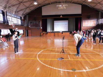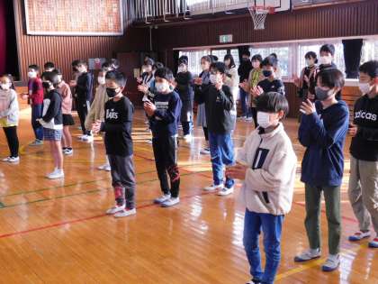 今回の集会は6年生のみが体育館に集まり、オンラインでの音楽集会となりました。