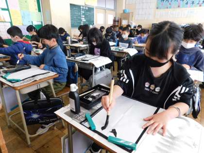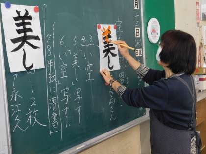 4年2組では校内書初め展の清書の授業をしていました。4文字を2文字ずつ練習してから本番です。上手に書けた子を紹介し、さらによく書くために朱を入れてます。