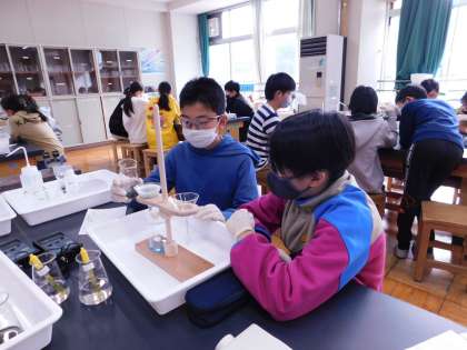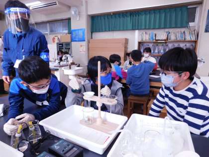 黄色い液体が水色の液体に、そこから茶色い付着物が取り除かれた液体がビーカーにたまります。