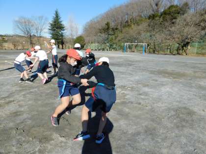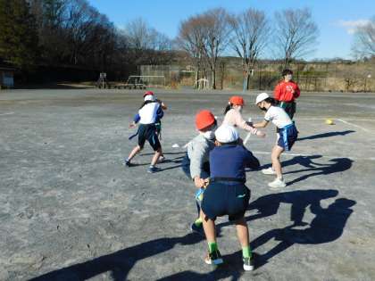 続いて、2人1組で攻撃側と守備側に分かれて、タグを取り合いました。