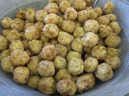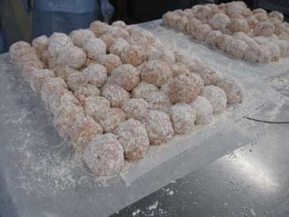 肉団子は丸めて小麦粉をまぶし、油で揚げています。