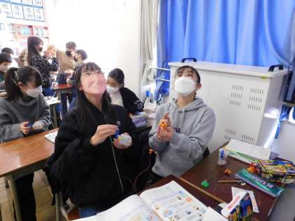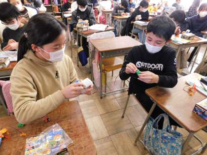 手回し式発電機を使い、電球の明るさやモーターの回転を調べています。