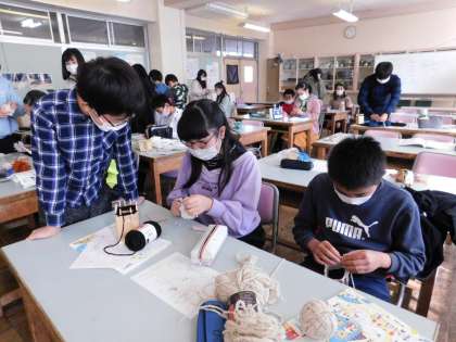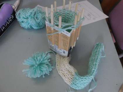 牛乳パックと割り箸を使って、編み物をしています。ボンボンや細いマフラーもできます。