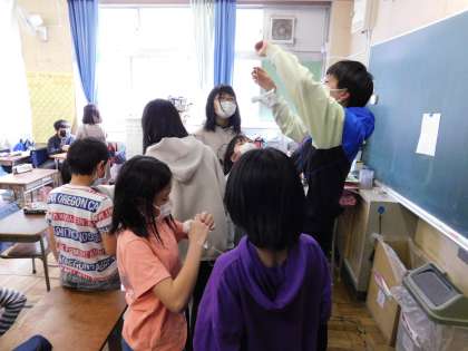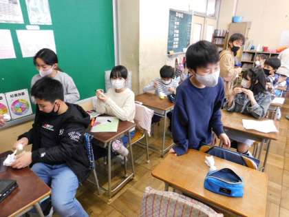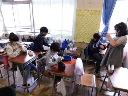 明日、社会科見学に行く予定の4年生がテルテル坊主を作っていました。本当に晴れてほしいです。