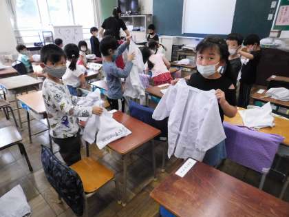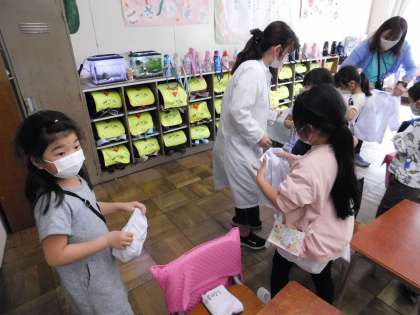 4月13日、1年生が初めての給食を食べました。まずは、給食白衣の着方を全員が教わりました。