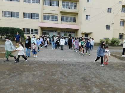 児童会の子の合図で、1年生が6年生に連れられて、行進します。