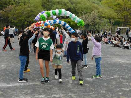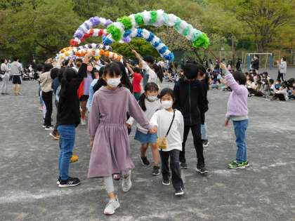 校庭中央には、4年生が持つアーチがあり、そこをくぐっての入場です。