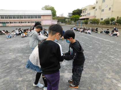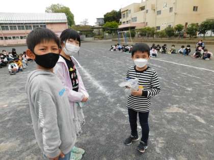 次に、3年生が手作りの「ブンブンごま」をプレゼントしてくれました。
