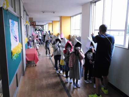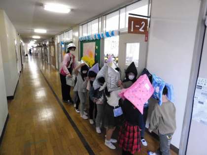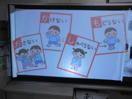 20日、今年度初めての避難訓練を実施しました。1年生も上手にできました。「お・か・し・も」の説明映像も使って、事前学習です。