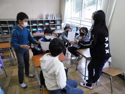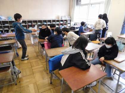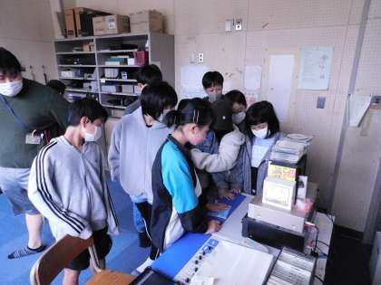 放送委員会です。密を避けるため、放送室には小グループで行って、練習してます。お昼の放送を担当してくれます。