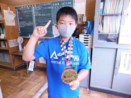 5年生の男子児童が、柔術の全国大会で優勝し、メダルを見せに来てくれました。おめでとう!