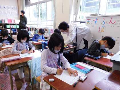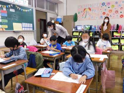 写真は1年2組です。ひらがなの「や」の書き取りをしていました。