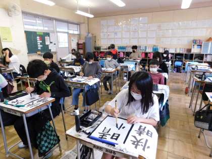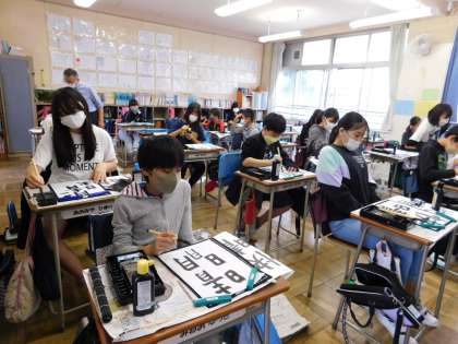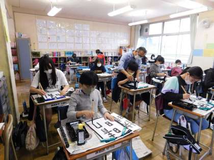 6年3組は習字の時間です。「快晴」と書きました。