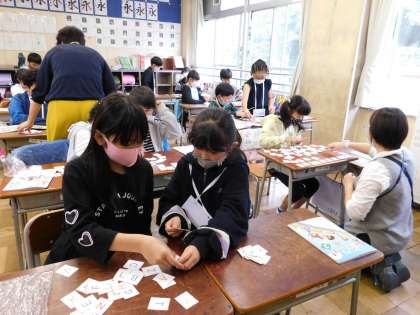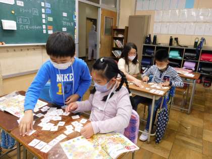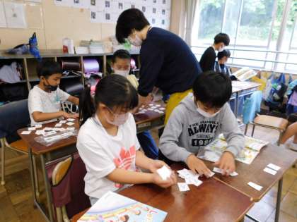 4年2組でも、外部講師の先生による外国語の授業を行っていました。ペアでアルファベットカードの大文字・小文字を並べていました。