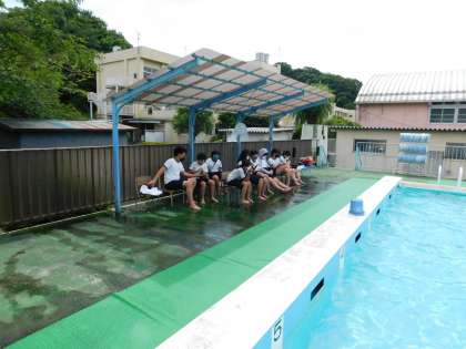 見学の子も、体育着でひさしの下で見学です。