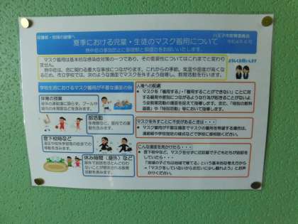 熱中症対策として、屋外等、必要な場面においてマスクを外すよう指導しています。八王子市リーフレットを校内に掲示しています。