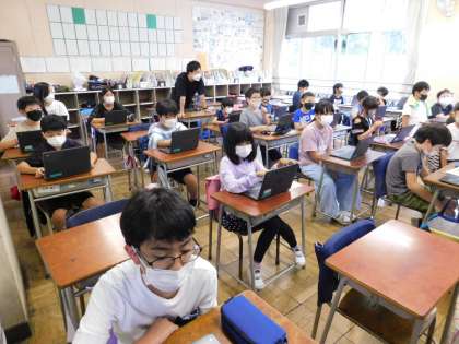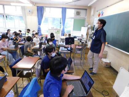パソコンクラブは大勢いるので、2教室に分かれて行います。今日はゲストティーチャーが来て、スクラッチを学習しました。