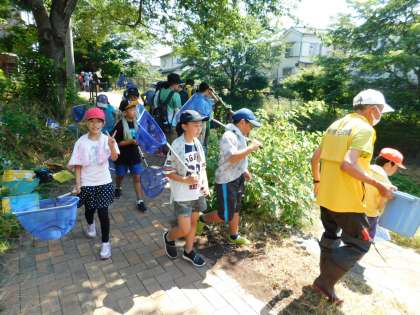 いよいよ、実際に網を使って水生生物を捕まえます。