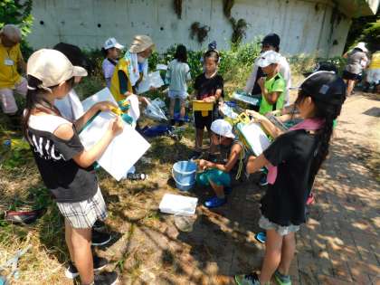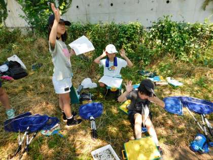2回目終了。捕ってきた水生生物を確認しながら、特徴をメモしていきます。