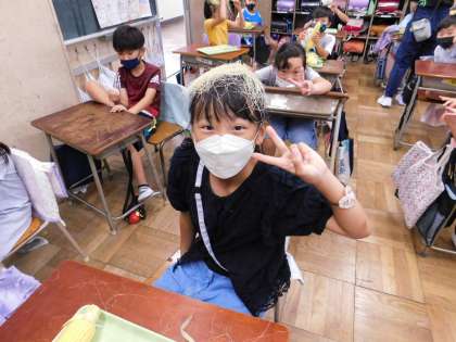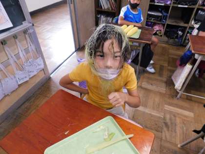 むき終わった子が、ちょっとおもしろい姿に・・・。食べ物で遊んじゃいけないのですが、3年生らしさが出てます。