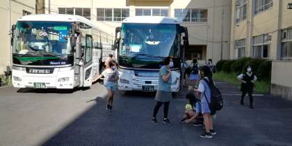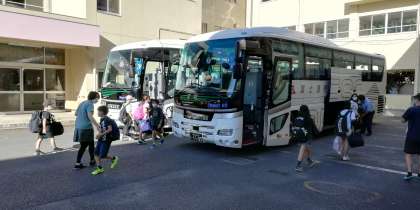 いよいよ、5年生の清水林間学校が始まりました。バスも到着しました。