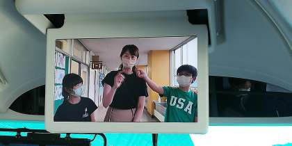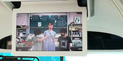 車内では、先生方へのインタビュービデオ動画が流れています。