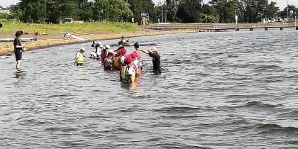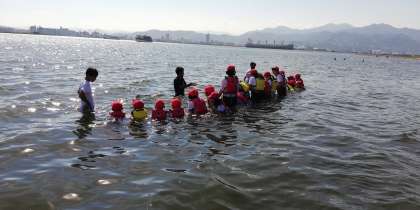 準備運動のあと、水慣れで海に入ります。救命胴衣を付けているので、よく浮きます。