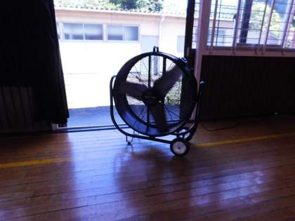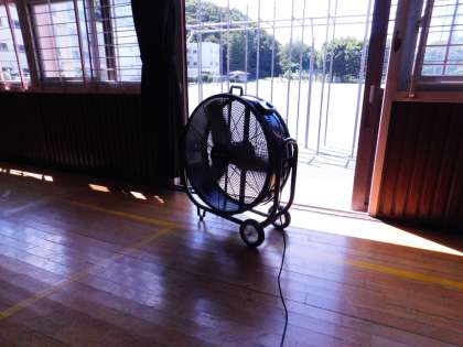 体育館では大型扇風機が2台フル稼働しています。