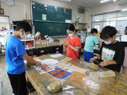 初めてのお面作りです。粘土を袋から出し、空気抜きをしています。