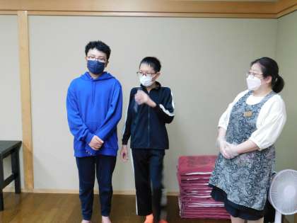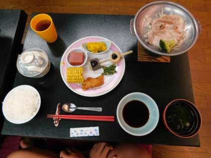待ちに待った夕食です。一人一人膳に盛られ、同じ方向を向いて食べます。おいしそうなメユ—が並んでいます。宿の方からメニューの説明がありました。
