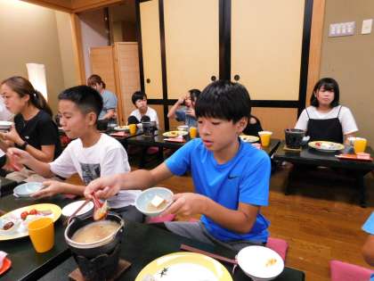 朝食中です。お腹もいっぱいになりました。これからハイキングに向かいます。