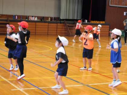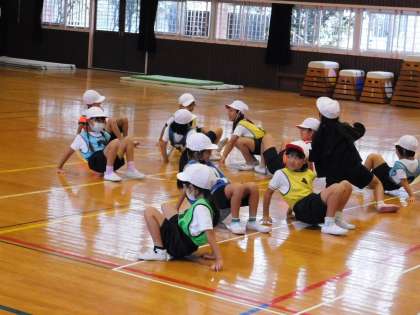 体育の「マットを使った運動遊び」の授業でした。まずは準備運動です。先生の指示に従い、しっかり身体をならします。
