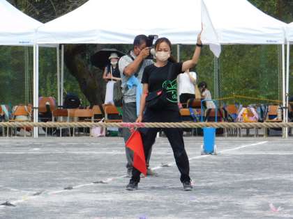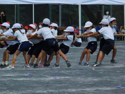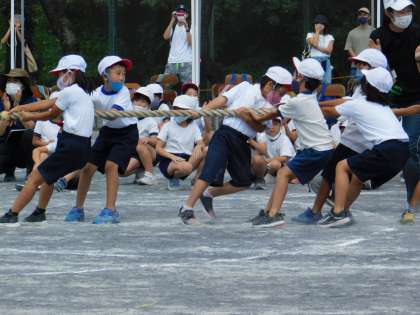 「追いかけ綱引き」です。まずは1・2年生が普通の綱引きに挑戦です。見事、白組が勝ちました。