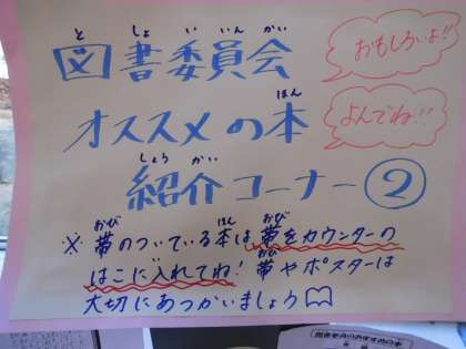 色別班読み聞かせ、読書ボランティア読み聞かせに続いては、本紹介の取組です。今年は先生方による「本の帯作り」以外に、図書委員の子が帯作りや紹介メッセージカードを作ってくれました。
