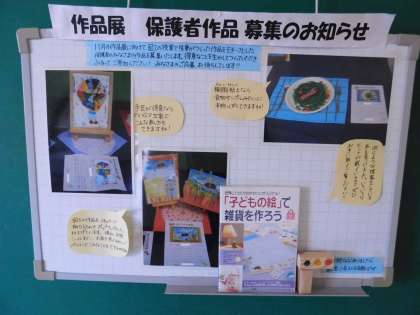 図工室前には「保護者作品募集のお知らせ」が貼られていました。出品お待ちしています。